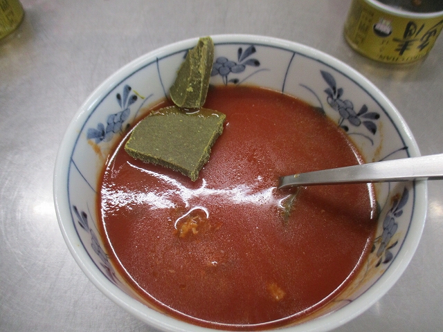 まずは容器に野菜ジュースとサバ味噌缶を汁ごと入れます 。スプーンを使って、サバの身を食べやすい一口サイズにほぐしていくのがコツです