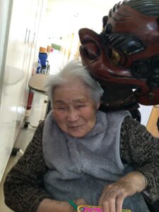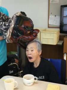 棟内では、獅子舞いが各利用者様を噛みながら回っておりました。獅子舞いを怖がられたり、笑顔で嚙まれたりなど皆様とてもいい表情をされております。