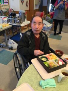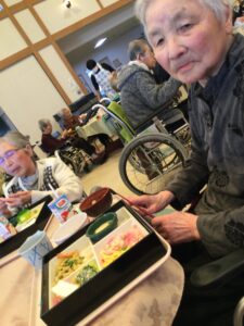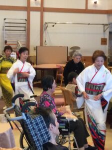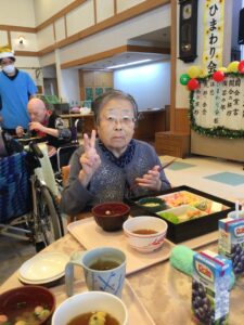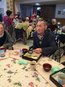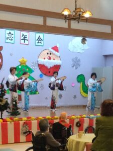 藤棟 忘年会① 今年も、年末恒例の忘年会を開催しました。 「ひまわり会」様の演芸を鑑賞され皆様とても楽しまれておりました。 続いては、お楽しみのお食事の時間です。 豪華なお膳を目の前に、皆様笑顔がこぼれておりました。