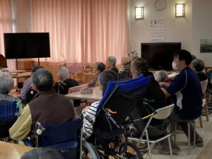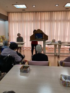 藤棟 紙芝居 ボランティアの「たかの杜紙芝居」の方々がいらっしゃいました。 お正月にちなんだ紙芝居を持ってきて下さいました。 紙芝居や皆様で歌を歌い楽しいひとときを過ごしました。 ありがとうございました。