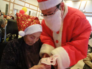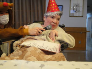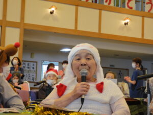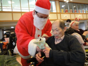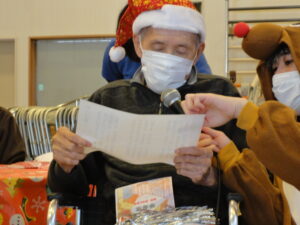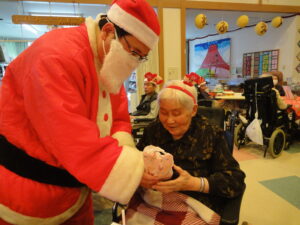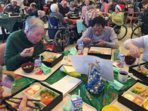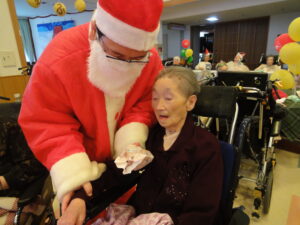 🎄令和7年度萩棟忘年会が開催されました🎄 12月9日火曜日、1階多目的ホールで萩棟忘年会が開催されました。 萩棟忘年会では、最初にカラオケ大会が行われました。 カラオケ大会では、歌っている利用者様はもちろんのこと、カラオケを聞いている利用者様もタンバリンを鳴らしたり、ボンボンを振って、カラオケを楽しんでおりました。 カラオケ大会後の会食では、フライドチキンやピラフ、茶碗蒸しなど豪華なメニューを召し上がられております。 また、職員扮するサンタクロースから利用者の皆様にクリスマスプレゼントが配られました。皆様とても喜んでおりました。 カラオケ大会に会食、クリスマスプレゼントなどのイベントを皆様楽しまれ、とても良い時間を過ごされました。 来年も皆様にとって良い1年でありますように!