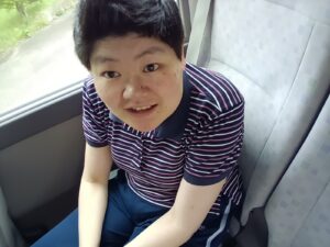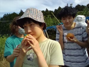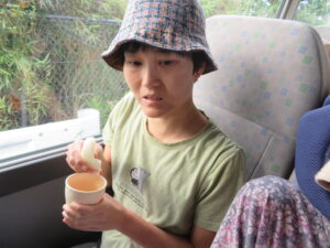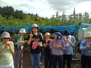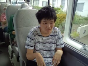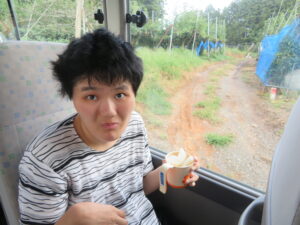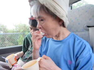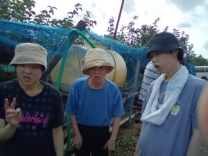 🚌利府の梨園へドライブ🚌 ~おしどりユニット~ 9月9日(火)午後、利府町にある梨園へマイクロバスに乗ってドライブに行きました。 天候は、出発時には今にも雨が降りそうな曇り空でしたが、利府町に入ると太陽が出て 青空となりました。 梨園まで、マイクロバスで出発! 車中の様子です。 皆で、梨畑をバックに記念撮影をしました。 もぎたての新鮮な梨とお茶を頂き、「梨が甘くて、とっても美味しい」と話されていました。 また、「もっと梨食べたいね」、「また、来ようね」、「今度はジュースも飲みたい」等とお話を しながらにこやかに帰園しています。
