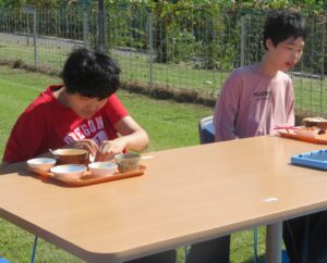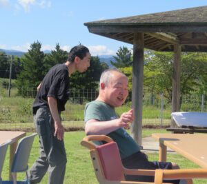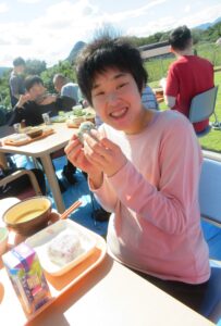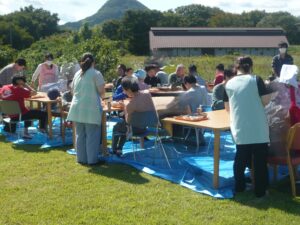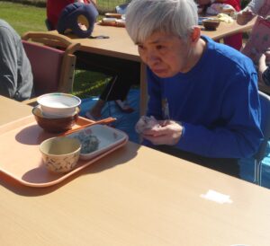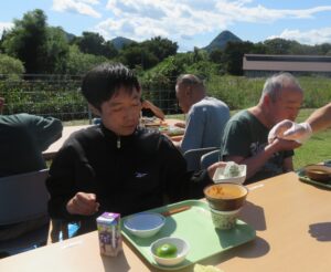 芋煮会を行いました🍠 晴れたり、雨が降ったりと、天気の変わりやすいこの季節… 体調はお変わりないでしょうか。 食欲の秋が到来し、はちくら園では芋煮会が開催されました。 芋煮会当日は、澄み渡る秋晴れ🌞 園庭にレジャーシートを大きく広げ、芋煮とお好みのおにぎりに舌鼓を打たれました。 美味しさに笑顔がこぼれ、「美味しい!」「おかわり!」と大盛況。 皆様、晴天のもと秋の味覚を堪能され、大満足のご様子でした。