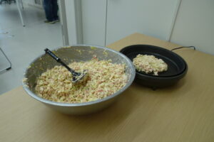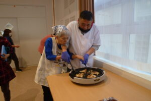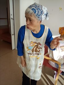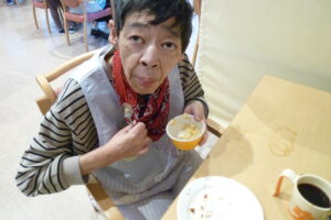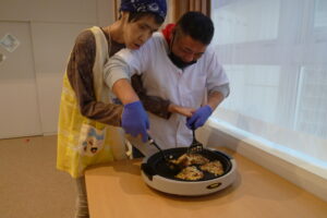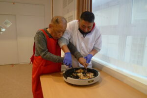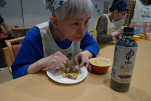 男性利用者様も頑張って、お飲み焼きをひっくり返しています。火傷に注意!
