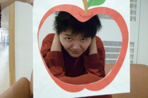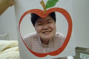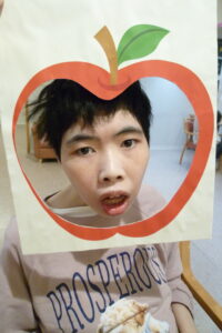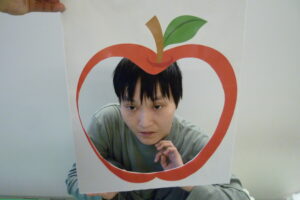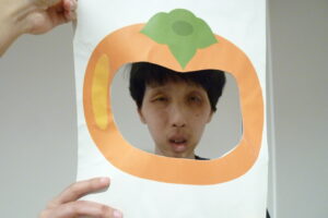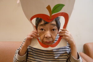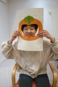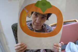 皆で柿や🍎りんごなどのフルーツの顔はめをして、記念撮影をしています。