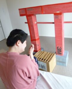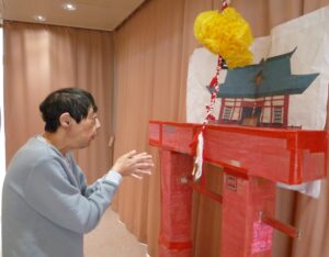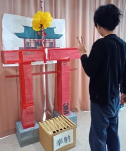 職員お手製の鳥居と賽銭箱で、はちくら神社が建立し、皆様でお願い事をしました。