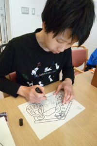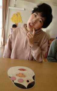 沢山のパーツを手に取り、一つ一つ丁寧に選びながら、ヒョットコやオカメの顔を完成させました!