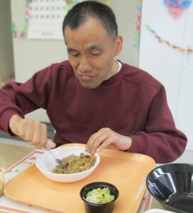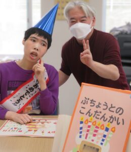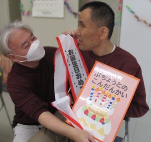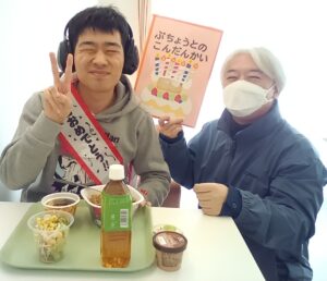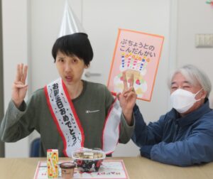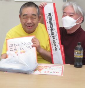 部長との懇談会🎂 はちくら園では、利用者様の誕生月に部長との懇談会を開催しています。 カラフルなランチョンマットや室内の装飾で盛大に誕生日をお祝いします🎉🎉 ピザや牛丼、チョコケーキ、パフェなど、好みのご馳走を選び、テーブルを囲みます🙏 「美味しいね!」「誕生日、嬉しいな。」 会場からは、楽し気な声が飛び交います👏皆様、素敵な笑顔です! 和やかな雰囲気のなか、部長との歓談を楽しまれました🤭