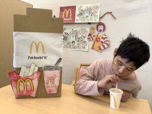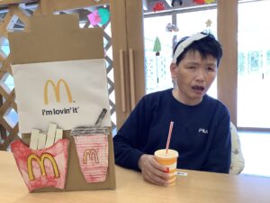 マクドナルドパーティー🍔せきれい・はくちょう🍟 12月12日にマクドナルドパーティーを開催しました。 ハンバーガー、ポテト、ジュースのセットを皆様美味しそうに召し上がっています。 飾り付けられた食堂で記念撮影📸
