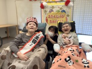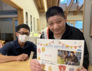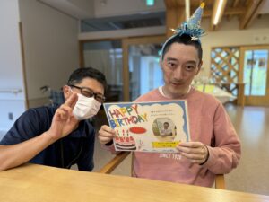 9月 誕生会 9月に誕生日を迎える利用者様の誕生日会を開催いたしました。部長・副部長からプレゼントと誕生日カードをお渡しし、他の利用者様からも祝福を受け、和やかな雰囲気の誕生会となりました。これからも、素敵な笑顔で過ごせますよう願っています。