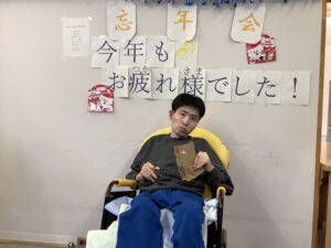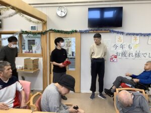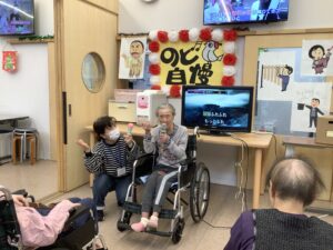 12月 忘年会&クリスマス会 毎年恒例の忘年会&クリスマス会が各ユニットで開催されました。 男性利用者様たちは、サンタさんからクリスマスプレゼントを貰い、とても喜ばれておりました。 女性利用者様たちは、のど自慢大会やサンタさんによるマジックショーを楽しまれておりました。