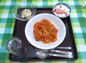 2日目昼食:スパゲッティナポリタン、ポテトサラダ、杏仁豆腐